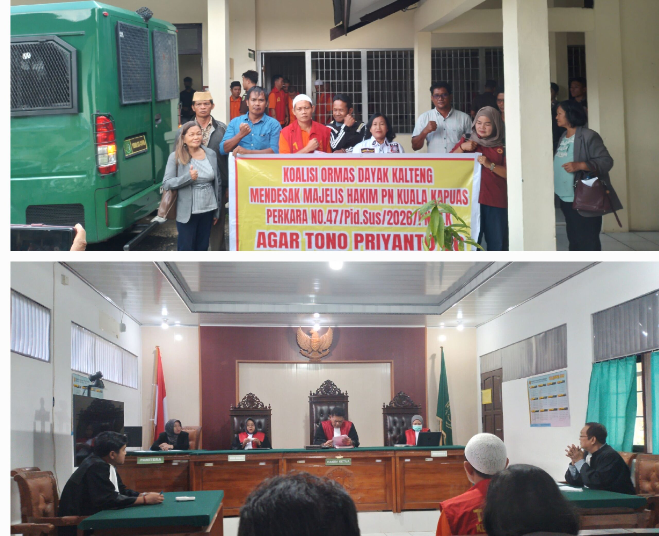Megawati, Ketua Aliansi Dayak Bersatu (ADB) yang tergabung dalam Koalisi Ormas Dayak Kalteng mengaku terkejut dengan fakta persidangan bahwa Perkara Tono diketahui ada penambahan 2 pasal yang memberatkan Tono dengan ancaman hukuman 7 dan 15 tahun penjara diduga dilakukan oleh Penuntut umum. Hal ini muncul dalam pembacaan Perlawanan Terdakwa oleh Advokat. Diketahui bahwa penyidik Polda Kalteng hanya menerapkan pasal 448 ayat (1) KUHP baru tentang Pengancaman. Namun Dalam Dakwaan Ada tambahan 2 Pasal yaitu Pasal 307 dan 306. “Kami duga kuat ada konspirasi dalam memgkriminalisasi Tono, agar dipenjara lebih lama dan tak bisa membela Haknya atas Tanah miliknya”, ujar Mega Selasa 31 Maret 2026 usai mengikiti Persidangan.