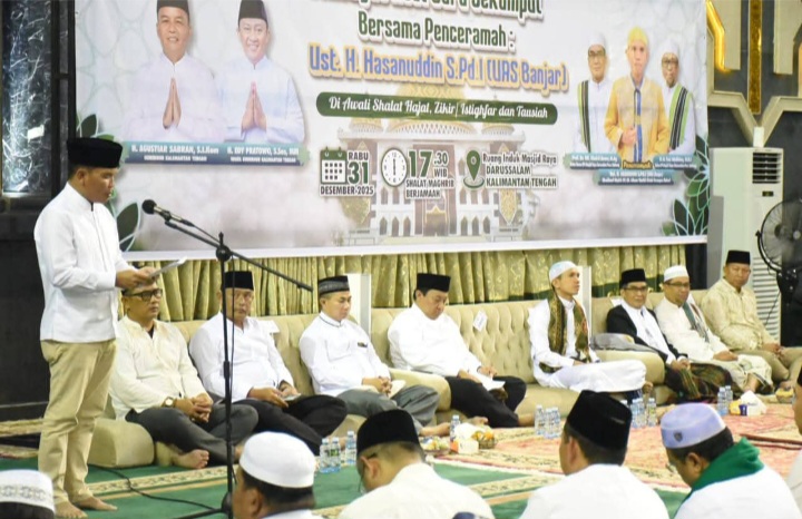 Gubernur Kalimantan Tengah Agustiar Sabran bersama Wakil Gubernur Kalimantan Tengah Edy Pratowo menghadiri Peringatan Isra’ Mi’raj Nabi Muhammad SAW yang dirangkaikan dengan Muhasabah Menyambut Tahun Baru 2026 serta Haul Guru Sekumpul, bertempat di Masjid Raya Darussalam, Palangka Raya, Rabu (31/12/2025).