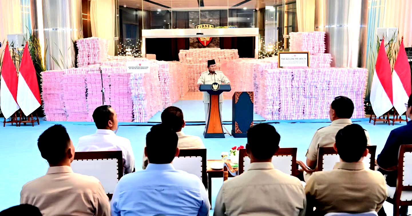 Presiden Prabowo Subianto menyaksikan penyerahan laporan capaian hasil Satuan Tugas Penertiban Kawasan Hutan (Satgas PKH) dan penyelamatan keuangan negara tahun 2025 yang digelar di Gedung Utama Kompleks Kejaksaan Agung Republik Indonesia, Jakarta, pada Rabu, 24 Desember 2025.